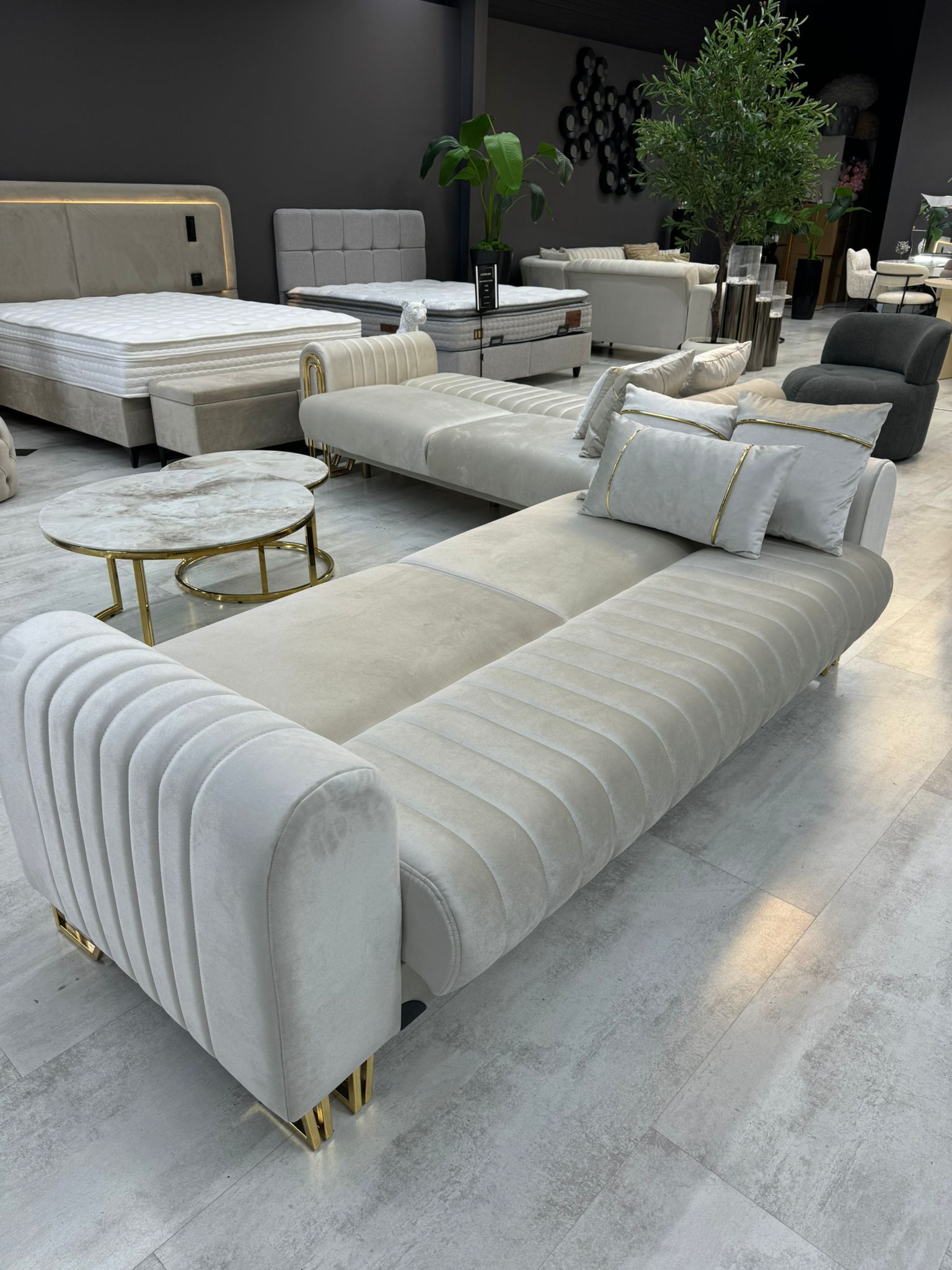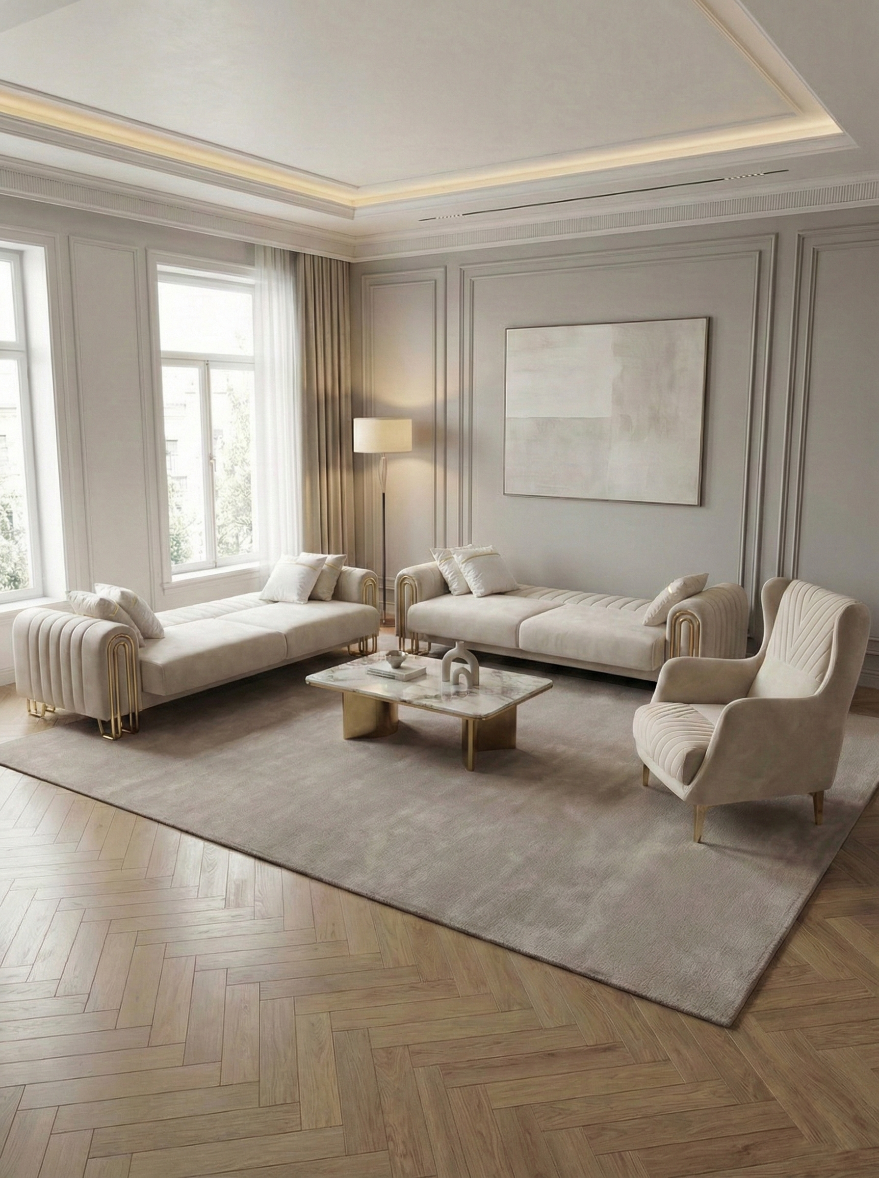 Apportez une touche de prestige à votre salon avec ce somptueux canapé 3+3+1 au design raffiné et aux finitions dorées modernes. Son allure chic et sophistiquée en fait une pièce maîtresse idéale pour un intérieur élégant et contemporain.