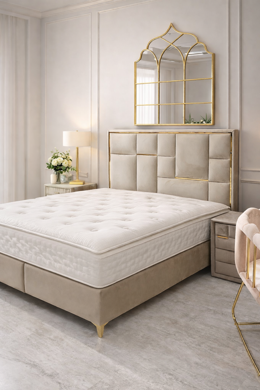 Revêtu d’un velours beige doux et raffiné, ce modèle offre une finition haut de gamme tout en restant chaleureux et intemporel. Les pieds doré contrastants soulignent son style moderne et structuré.