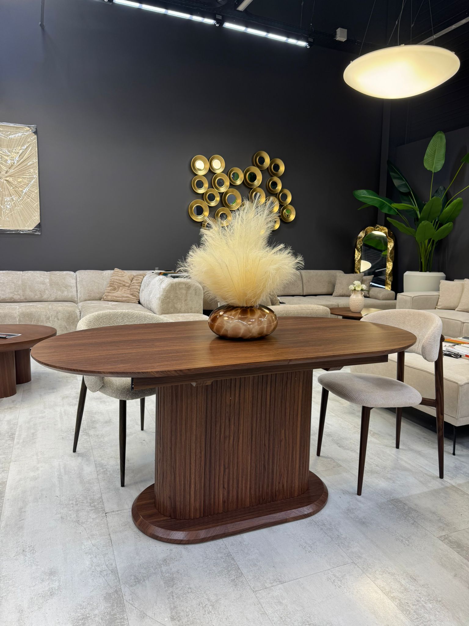 Apportez une touche d’élégance et de modernité à votre salle à manger avec cette table extensible effet noyer, au design épuré et chaleureux. Son plateau aux lignes douces et son piètement central sculptural en font une pièce forte, idéale pour un intérieur contemporain.